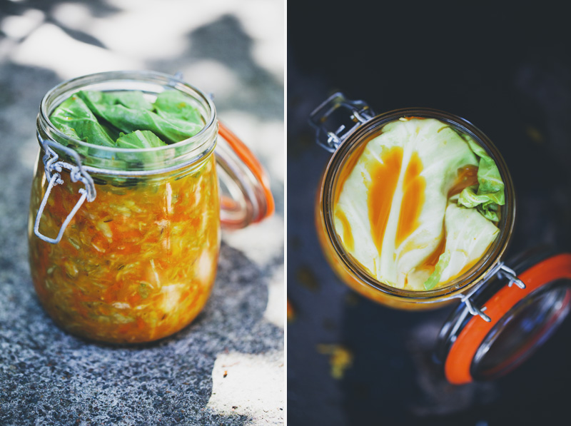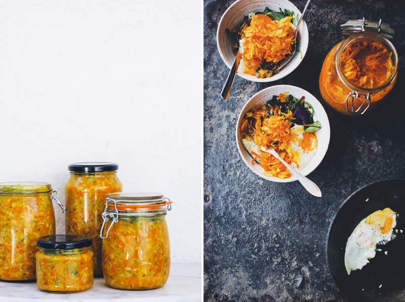 Here in Scandinavia, we have quite the tradition of pickling, preserving and fermenting. But weirdly enough, Luise’s and my interest for fermented vegetables actually sparked during our recent trip to Australia. Almost all the cafes we frequented had at least one salad or bowl that was topped with fermented vegetables or sauerkraut. And the health food stores there have whole isles with different brands of organic raw fermented/cultured vegetables. It didn’t take long until we were hooked. The flavours were just so fresh and the acidity added a real kick to whatever we paired it with. And in a strike of unbelievable luck, we met Vivianne on our potluck picnic in Sydney, she is one of the founders of Raw Sisterhood, a Bondi based company that makes incredibly tasty fermented vegetables, raw crackers and raw granola. She promised to teach us some of their secrets and now we get to share one of their recipes here. We made the first batch together in her house and we have continued making it now when we are home. They call this version Golden Goodness and it’s basically wild fermented cabbage and carrots flavoured with turmeric and garlic
