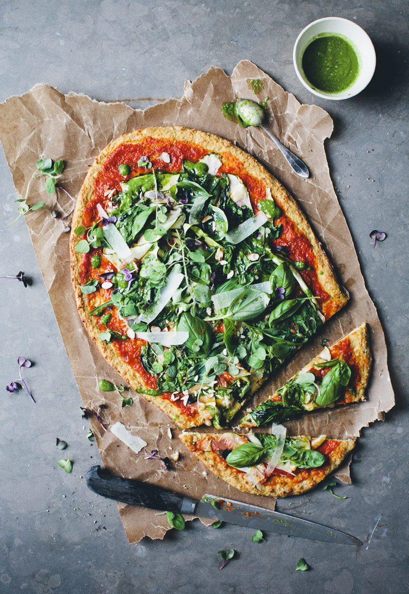 It struck us that we haven’t posted a pizza recipe here in a while. Which perhaps had you thinking that we don’t eat pizza very often in our home? Well that’s not actually true. We eat lots of pizza, but most of the time it’s not the super greasy kind. For us, pizza can actually be a quite fun and fresh way to eat vegetables. It’s of course also one of the easiest ways to cook together with your kids. (Right after we were done shooting this, Elsa did a self portrait pizza; tomato eyes, zucchini mouth and basil hair. So funny!). We often do rye or spelt pizzas (like our Rustic Potato Pizza!), but this here is an entirely different thing. Say hello to a completely grain free pizza base made on … Cauliflower!