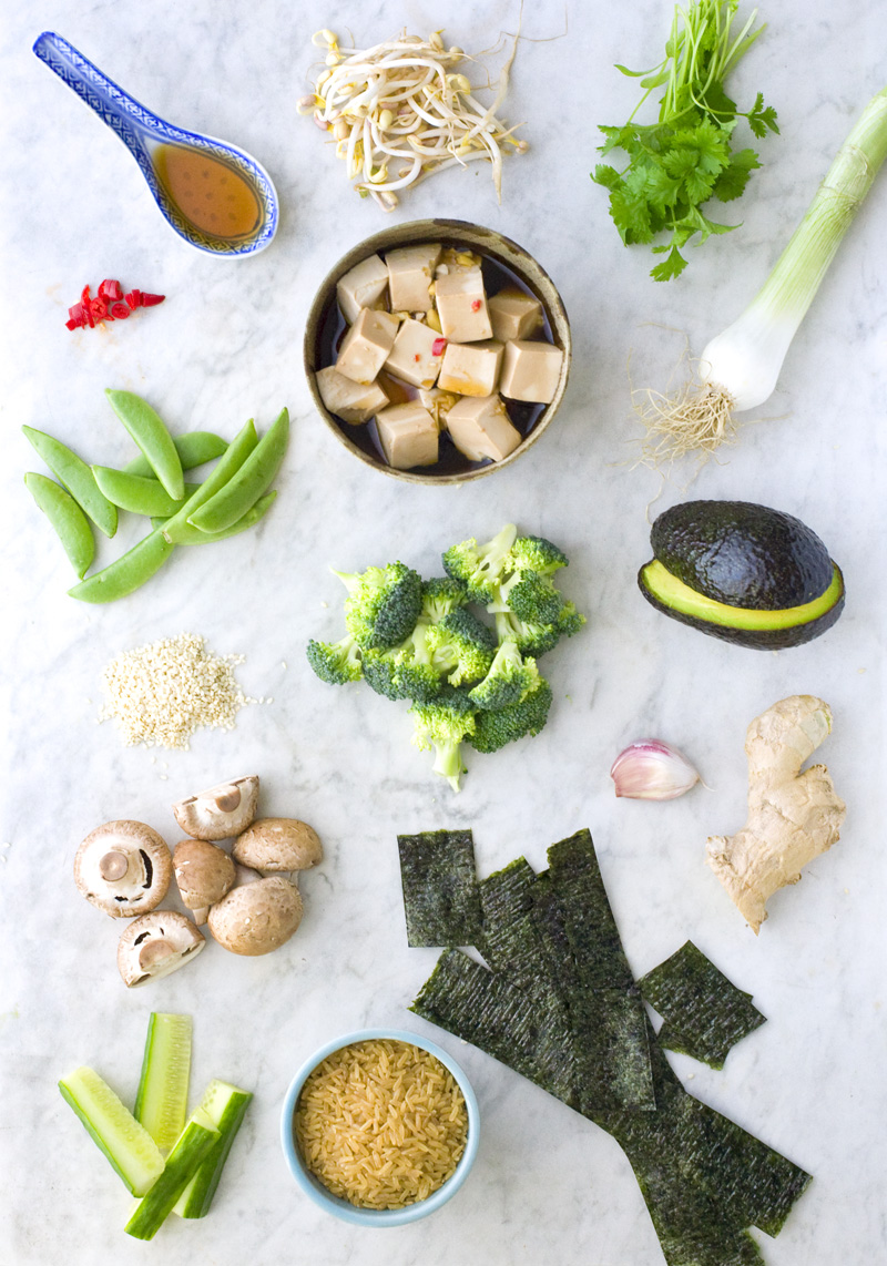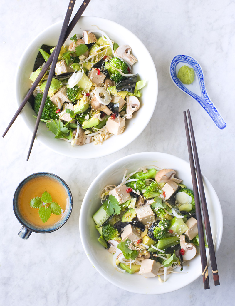 This is what happened one day when we felt like making our own vegetarian sushi but were too lazy to go through the whole Japanese rice and rolls procedure. Instead we marinated tofu, boiled some brown rice, chopped our favorite vegetables, cut the seaweed into pieces and turned sushi into a salad. And what a salad! The sesame oil, rice vinegar and seaweed gave the salad that sushi feeling, although with a more nourishing twist. We quickly realized that this dish actually had made it to our top-list of favorite dinner recipes (right next to our Lasagna and Quinoa & Kale salad).
