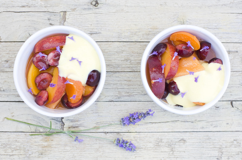 To serve, divide the fruit in 4 glasses or small bowls. Put a spoonful of zabaglione alongside. Sprinkle a couple of lavender flowers on top of it.