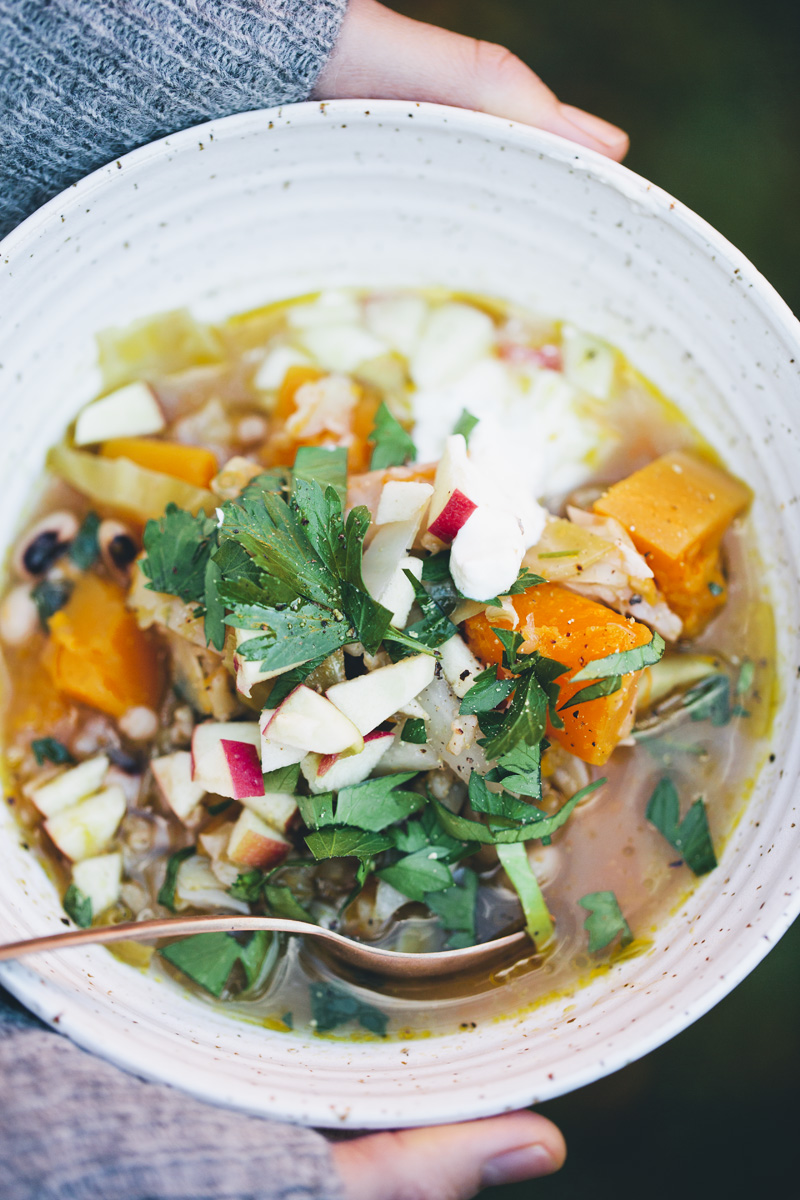We have kept the flavours quite simple in this stew and instead add extra herbs and diced apple as a fresh twist right before serving it. I imagine mushrooms and tomatoes would be a delicious addition in this stew too. You can also try a bolder choice of spices or other type of grains and legumes. You can even throw in a piece of parmesan rind as it simmers to add a nice umami flavour to the stew (just remember to remove it before serving).