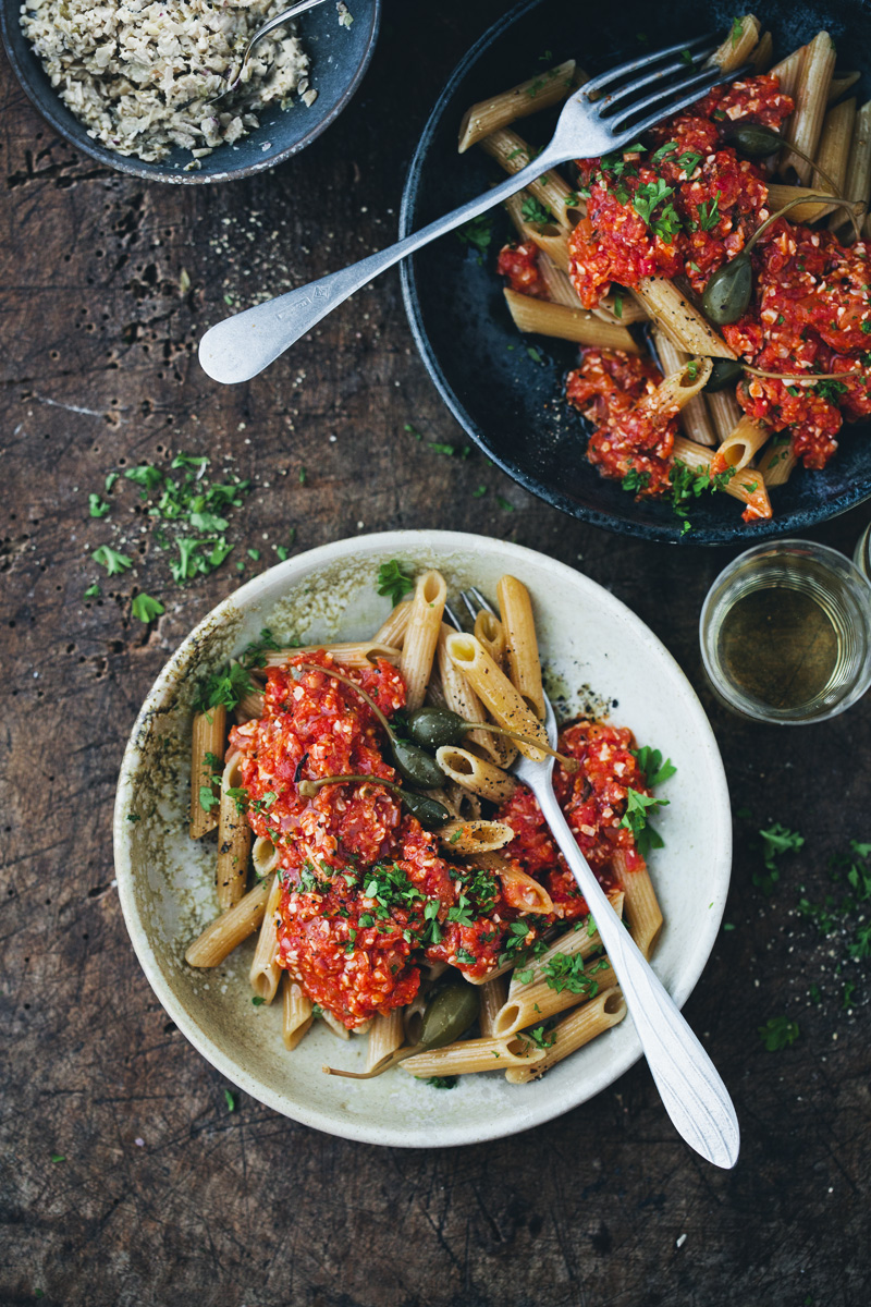 When the tomato sauce is ready, stir in 2/3 of the “tuna”, saving the rest for serving. Divide the pasta in 4 bowls, top with tomato sauce, capers, fresh parsley and a drizzle of olive oil.