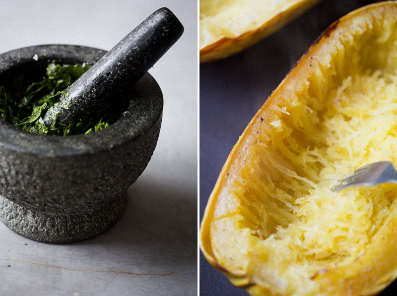 You can serve the spaghetti squash with any of your favorite pasta sauces. Or try this rustic parsley pesto, beluga lentils & roasted shiitake topping. Here we have kept the pesto very chunky, by simply grinding it in a mortar. But you could also make it creamier if using a food processor.
