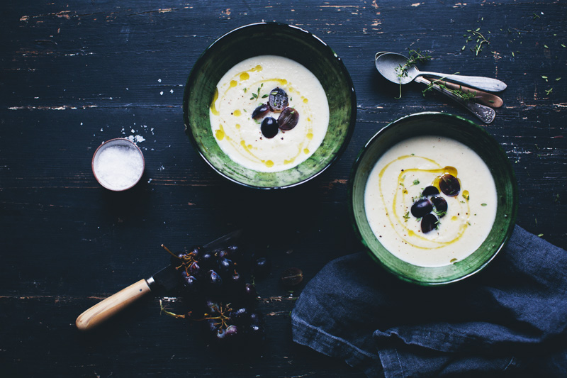 Hey friends, we are just checking in quickly from our chaotic life in an apartment filled with moving boxes to share a wonderful little soup recipe with you. It’s a savory, creamy and slightly sweet almond & garlic soup that we top with red grapes. It is kind of inspired by a Spanish White Almond Gazpacho, but our version is served warm and with roasted roots. We wanted it to feel like a thick warm almond milk with lots of flavor. It has quickly become one of our favorite recipes this spring, both as lunch and dinner. And the grapes on top truly adds a nice and fruity twist. If you are having guests over, it could also be really nice as a starter.